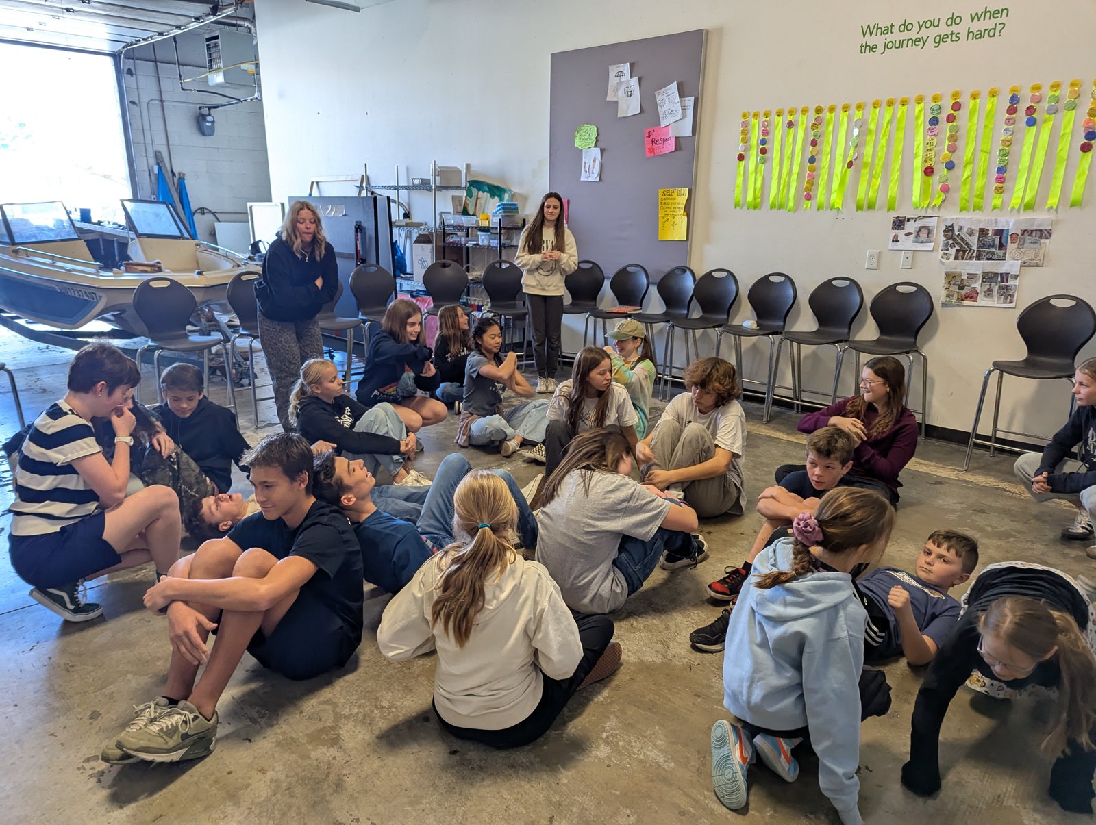 Learners coming to a guide to ask for a Town Hall (discussion and solutions) about the cleanliness of the studio bathrooms. Learners then all agreeing, on their own, that they can do a better job tidying up the bathroom after they finish using it.