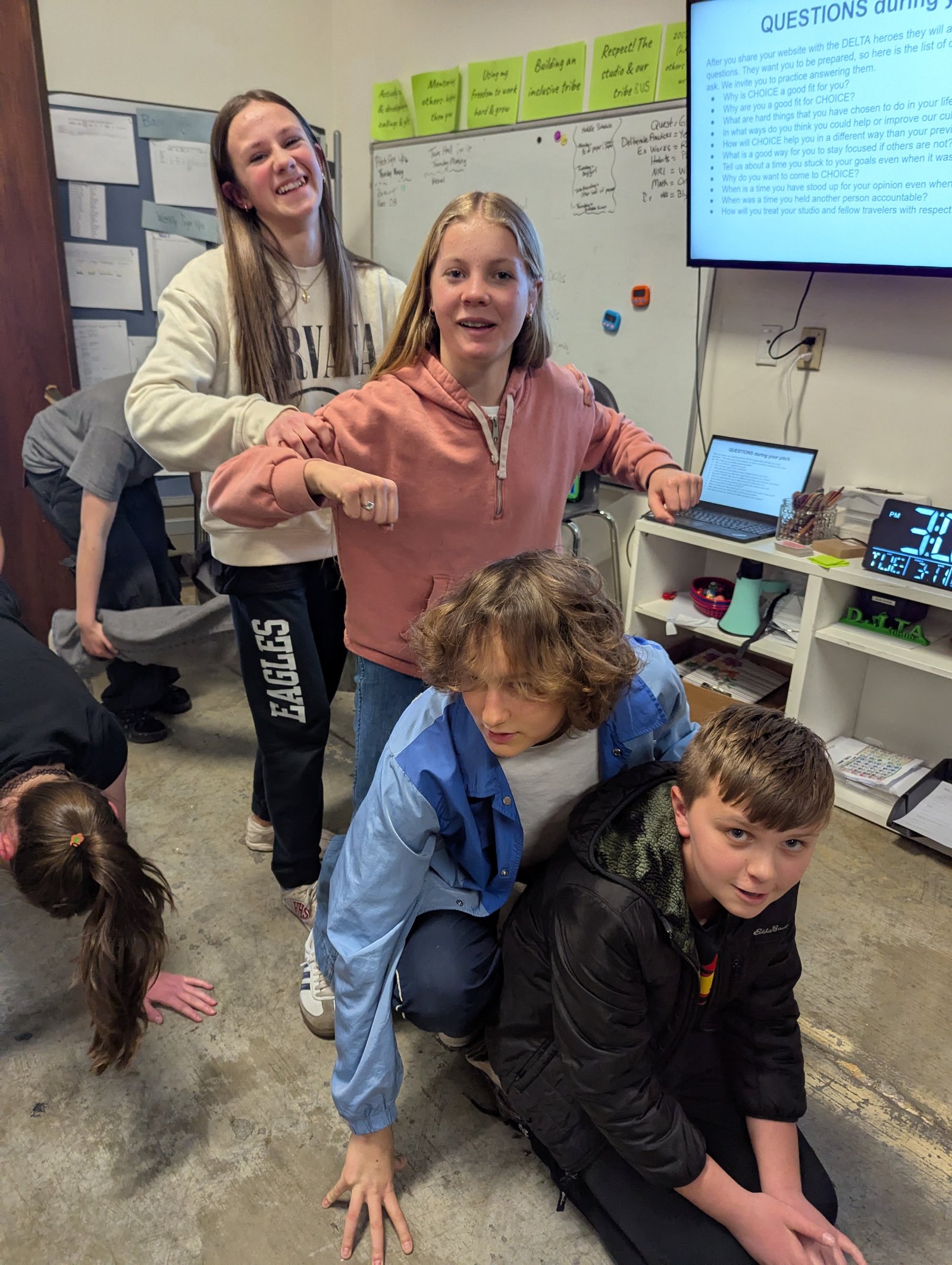 “Hands up stands up” when you walk into the studio (during CHOICE work cycle)