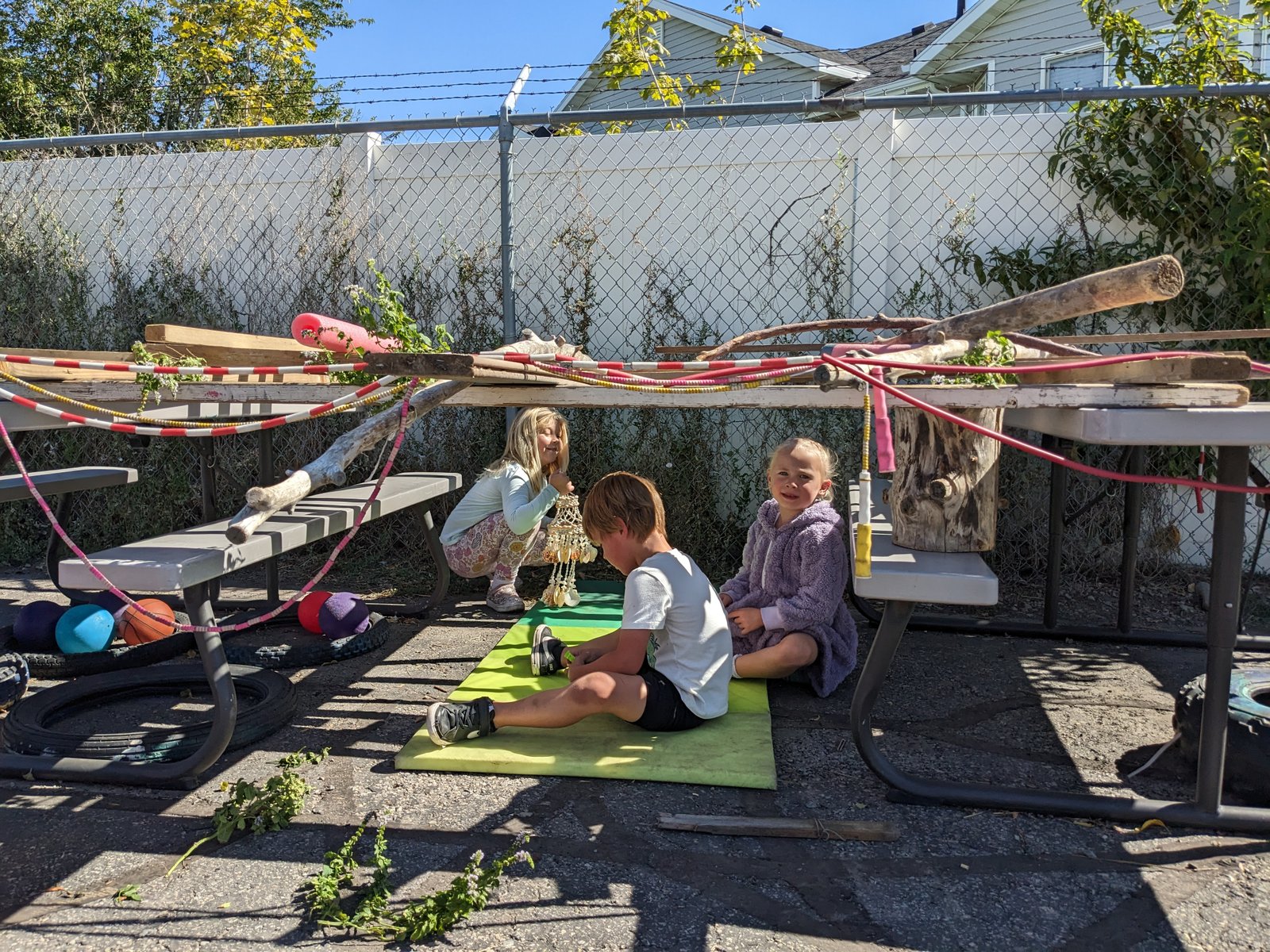 2- Spark heroes love their hour of outside time every day. Heroes explore, build, and imagine with a wide variety of random objects such as wooden pallets, jump ropes, kitchen dishes, even using the weeds along the back fence! This session we have seen sailboats, restaurants, a choreographed performance, forts, and a cat rescue. And of course we can’t forget the super popular GaGa Ball pit! Anytime conflict arises, we use that to practice working through disagreements.