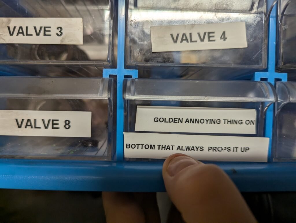 What a week for the DELTA Studio during Quest. There were lots of wins! The boat valves have all been removed from the head and are being cleaned up. After two ‘professional’ spring compressors didn’t work well, they resorted to a quick ‘bam’ on the valve stem with a sledge hammer… it worked! The heroes also thought (all on their own) to organize and label all their parts as they were taking them apart to facilitate the putting back together. Check out their awesome label names!