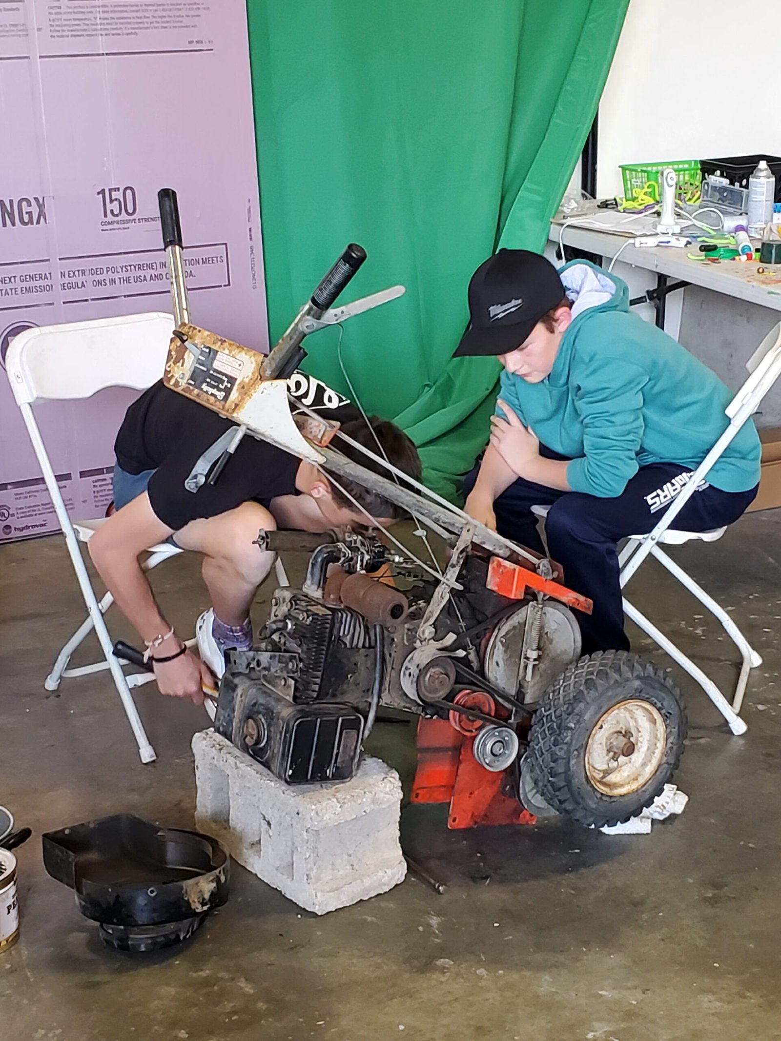 The GoKart team has the frame welding finished and is starting on the floor, steering and brakes. They are so proud of their welding work! The transmission has been disassembled and they are rearranging the gears to make it go fast, with less torque rather than slow with a lot of torque. There is a good set of gears and pulleys to start with.