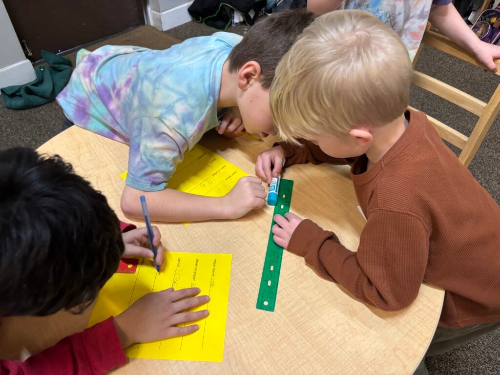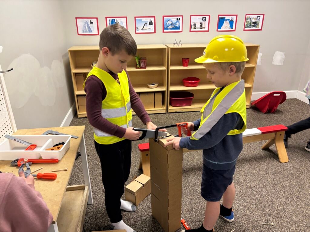 In the Spark Studio we are diving into the world of architecture and engineering during CHOICE work cycle (our “Quest” time). Heroes will be exploring bridges, tunnels, towers, finding ways to improve structures, studying famous architects, observing famous and local architecture, exploring building materials, and creating lots of their own structures! This week the Sparks discovered some of the tools of the profession and how to use them. Heroes learned how to use a compass and ruler to draw circles and measure inches and worked together to help each other complete challenges.